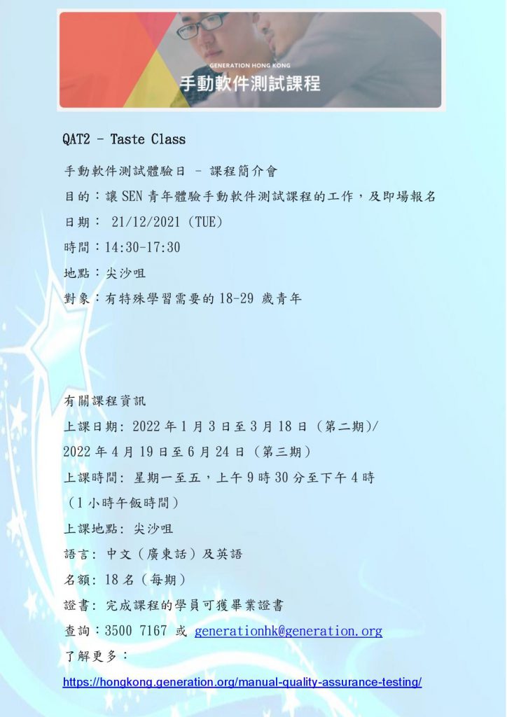 手動軟件測試體驗日和課程資訊 by webmaster | 12 月 10, 2021 | 外來資料, 職業資訊 | https://hongkong.generation.org/manual-quality-assurance-testing/
