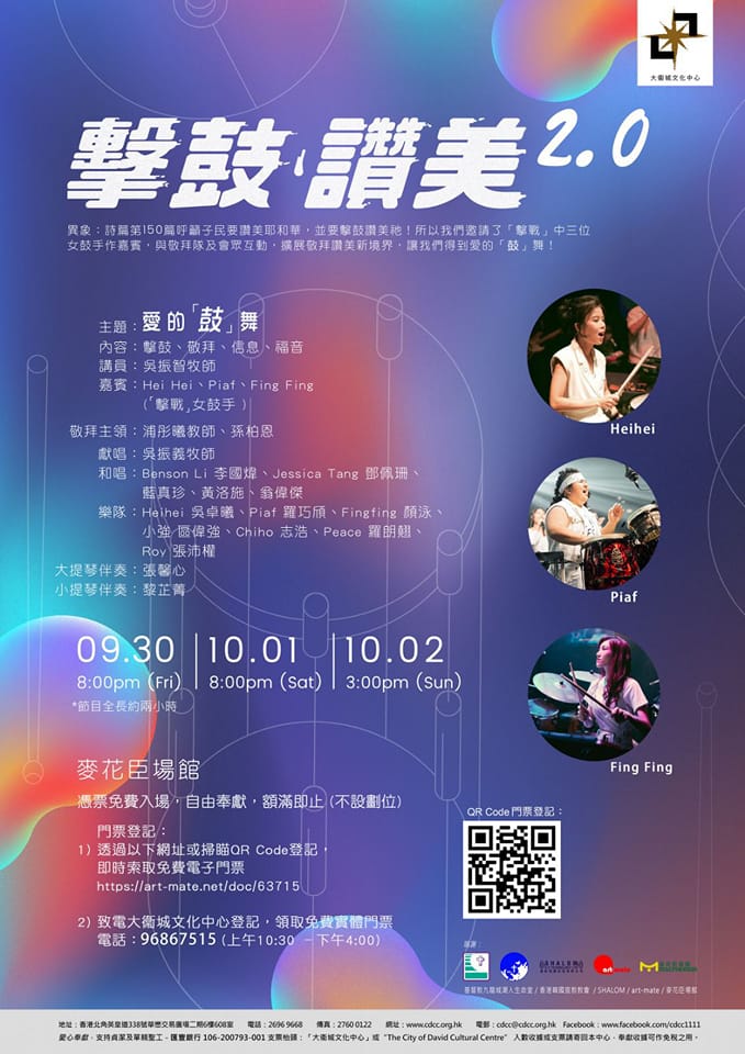 有關《擊鼓‧讚美2.0》音樂會欣賞事宜 by webmaster | 9 月 13, 2022 | 外來資料, 學校最新資訊 | 各位校友:【有關《擊鼓‧讚美2.0》音樂會欣賞事宜】音樂科賴韻鈴老師現有9月30日(星期五晚)免費門票,如校友有興趣需要門票,請致電(25107688)直接聯絡賴韻鈴老師索取。